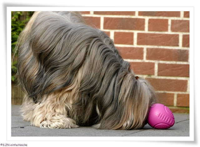 Des weiteren hatte ich ja recht oft im Rahmen des Adventskalenders berichtet, dass Socke einige Spielzeuge nicht mehr zum Apportieren nutzen kann, weil sie so schlecht Luft bekommt, wenn die Spielzeuge recht kompakt sind. Socke liebt sie zwar, aber muss das Spielzeug einfach zu oft ablegen. Insofern haben wir ihr einen kleinen luftdurchlässigen Ball gekauft, der beim Atmen hilft. Besonders schön ist hier zudem, dass der Ball auch recht lustig hüpft, so dass Socke gar nicht weiß, wohin er fliegt.