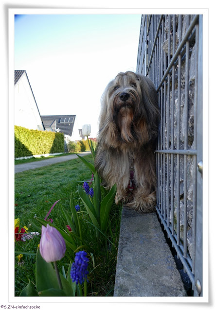 Hier bei uns im Wohngebiet gibt es teilweise sehr schöne Vorgärten und auch hinterm Haus machen es die Menschen schön. Und so werden jedes Jahr jenseits des Gartenzaunes und damit für die Allgemeinheit Tulpen und anders gepflanzt. Wir erfreuen uns sehr daran und wie Ihr Euch vorstellen könnt, habe ich - auch in diesem Jahr - einige Bilder mit Socke davon gemacht. In diesem Jahr trifft es gut, denn ich habe Socke schon einmal an dieser Stelle fotografiert. Die Bilder sind damals nicht so schön geworden wie in diesem Jahr, ohne mich selber loben zu wollen. Es lag nicht an mir, sondern an Socke, die einfach viel mutiger war.