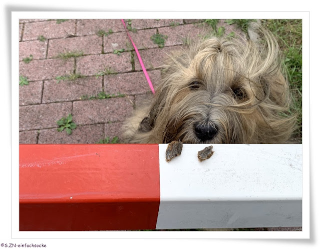 Unter anderem kamen wir am Zaun von Dackel Hektor vorbei. Socke zog weiter und ich fragte sie, ob sie nicht Hektor einen Gruß da lassen möchte. Das war eigentlich nicht ernst gemeint und schon gar nicht habe ich gedacht, dass sie das wirklich tut. Schaut aber selbst. Socke ließ ihm einen Gruß da.