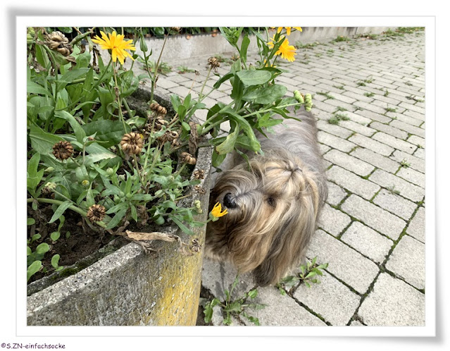 Wir zogen weiter und ich überlegte mir für Socke ein Suchspiel. Von den Blumen bzw. ihrer Farbe eben, ließ ich mich inspirieren. Und zu mehr hätte es bei meiner Müdigkeit auch nicht gereicht....