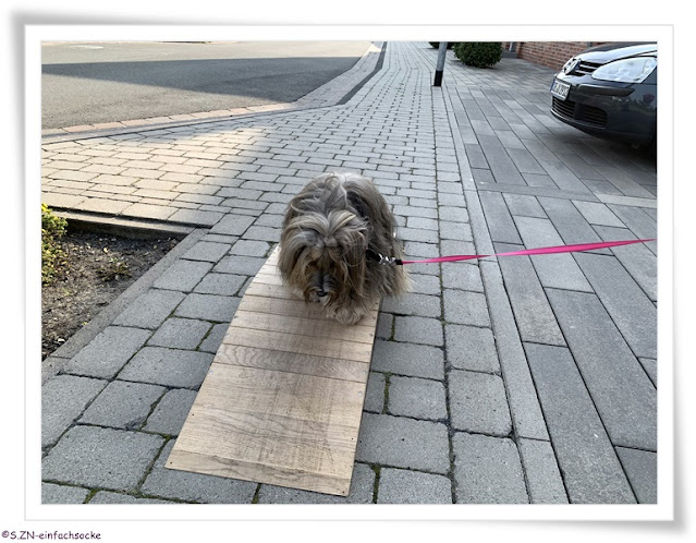 Bei uns ist das Moutinbike fahren unter den Kindern sehr beliebt und so findet man überall Rampen und dergleichen. Hier bot sich die Gelegenheit mit Socke etwas zu üben. Socke ist wirklich nicht die Mutigste und braucht viel Zuspruch und Motivation. Aber zum Schluss klappte es doch. Ich war sehr stolz auf Socke und die Menschen, die uns beobachteten lächelten uns an.