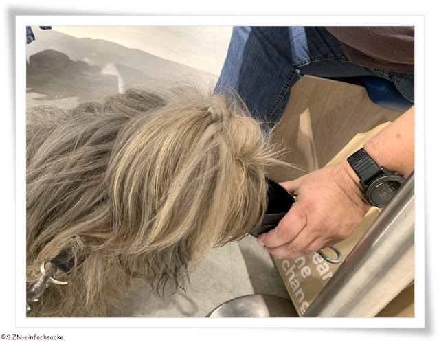 Wir waren am Ziel angekommen. Während der Socke-nHalter in der Kabine verschwand, versuchte ich Socke etwas zu beschäftigen, denn da kann dauern. Ja, nicht ich bin hier die Shopping-Maus, sondern ER!!!!!