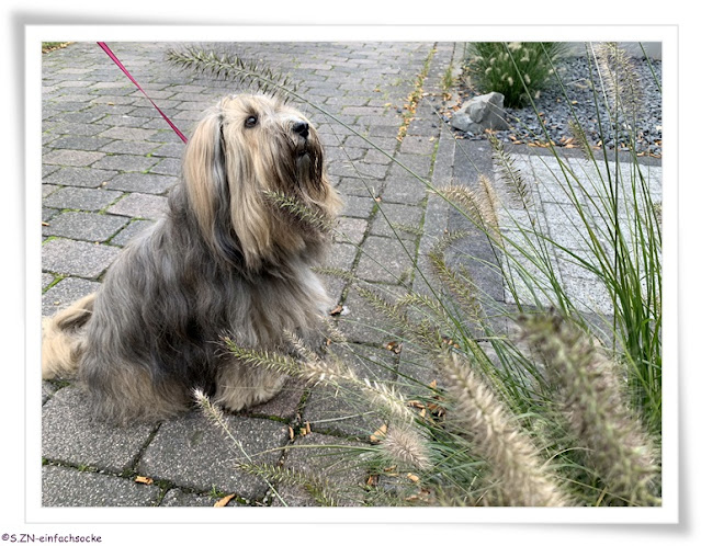 Gleichzeitig schnüffelt Socke interessiert und zeigt Interesse an ihrer Umwelt. Socke ist aber auch unsicherer, bellt viel mehr und zeigt an, wenn sich etwas regt. Ich versuche sie zu unterstützen, sehe aber nicht immer sofort, was sie bewegt.
