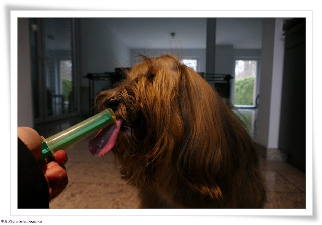 Zunächst bedarf es aber noch eines Bluttestes (sog. ACTH-Stimulantionstest). Der wird morgen Nachmittag gemacht. Wir könnten hier ein paar, nein ganz viele gedrückte Daumen gebrauchen, damit wir die Ursache finden und Socke richtig behandelt werden kann.....
