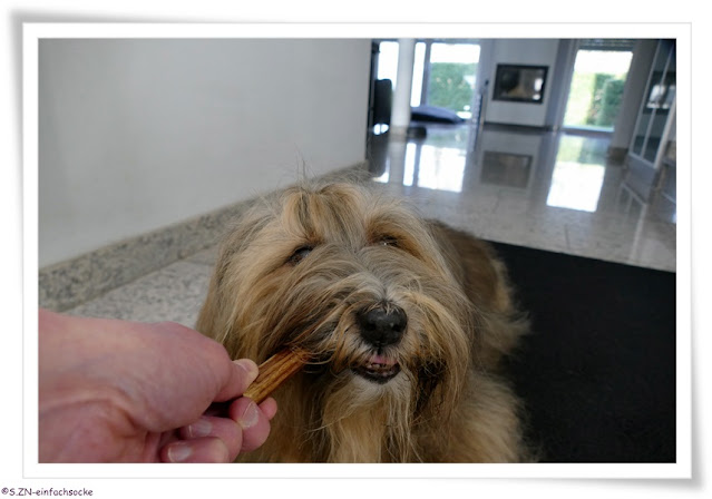 Nach dem Gassigang und dem Inhalieren bekommt Socke ihre Nachmittagsknuferei, die sie sich verdient hat.