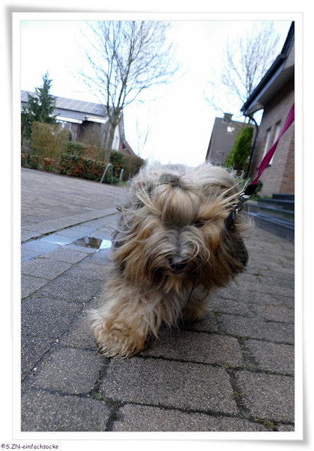 Wir waren auf einer Nachmittagsrunde unterwegs, bei der Socke zunächst keine große Lust hatte, irgendwann aber in Schnüffellaune kam.