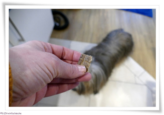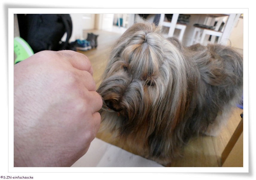 Damit Socke nicht ganz abbaute, boten wir ihr einige Lecketli und Dinkelzwieback an. Letzteren liebt sie und sie bekommt ihn heute täglich nach dem Frühstück betränkt mit Microorganismen und etwas Öl. Wenn Socke also nicht gut futtert, dann gibt es zumindest den Zwieback und der Magen ist nicht leer, was auch mich entspannen lässt.