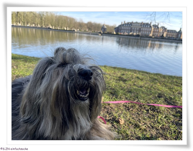 Socke etwas gelangweilt auf der Morgenrunde... ( Ich was Gähnen bei Hunden bedeutet und zwar nicht Müdigkeit, sondern Beschwichtigung und Stressabbau...)