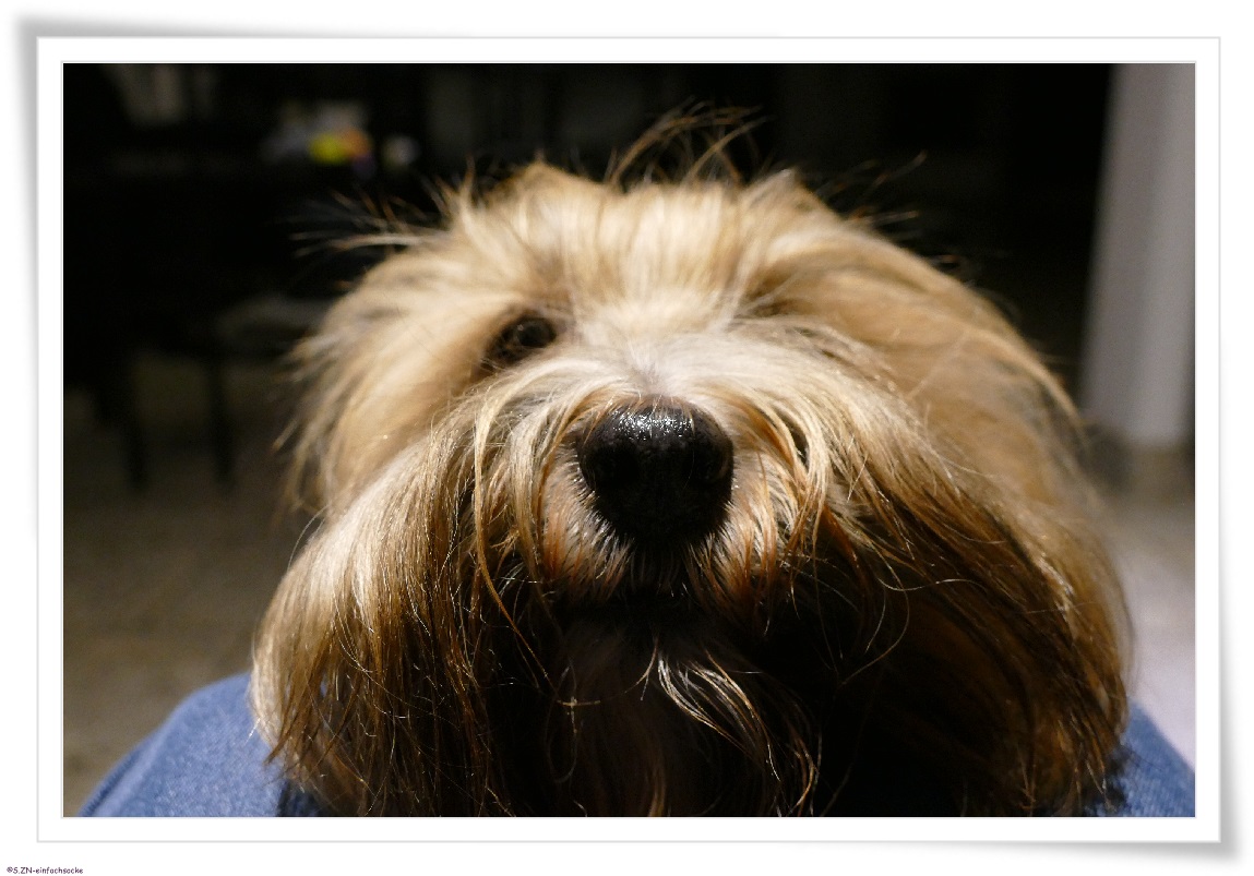 bevor ich mit Socke zur ersten Gassirunde das Haus verlasse, machen ich ihr ihren Zopf, kontrolliere die Augen und Ohren. Und an den Tagen, an den ich an den Betriebsort fahre, geschieht das sehr früh. Meist so gegen 05:15 Uhr. Das Söckchen ist dann oft noch sehr müde und der Kopf viel zu schwer, um ihn zum Frisieren oben zu halten. Oft dienen meine Knie als eine Art Ablage und Halterung, damit der Kopf nicht immer wieder nach unten sinkt.
