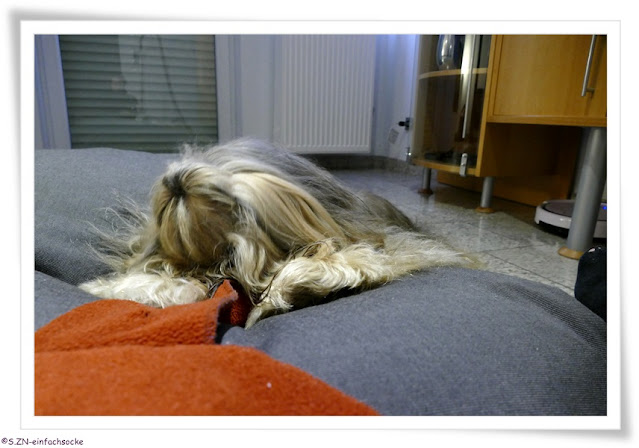 Am späten Abend, die Frisur saß wieder, gab es für Socke noch einen Sniftstar mit einigen Leckerlikrümeln. Socke liebt dieses Spielzeug, wobei sie in letzten Monaten diesen kaum noch alleine leeren kann. Mit zunehmenden Alter wird sie ungeduldiger und ungeschickter. Daher helfe ich ihr in der letzten Zeit sehr gerne....
