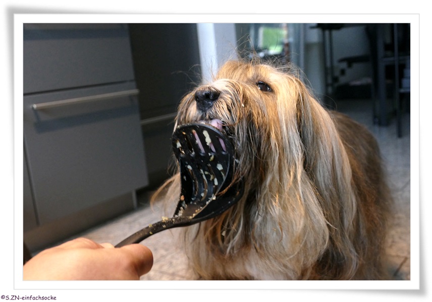 Socke schleckte also am Sonntagmorgen ihr Geschirr ab. Noch konnte sie es tun, denn ab Dezember 2021 wurde für Socke anders bekocht und da gab es nichts mehr zu schleckern. Also, lasst uns die schönen Bilder von der schleckenden Socke genießen.