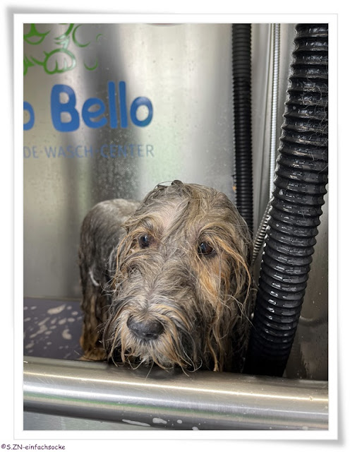 Und los geht es. Auch hier gibt es nicht viel zu berichten. Socke wird nass gemacht, zweimal shampooniert und der Schaum jedes Mal gründlich aus dem Fell entfernt. Das Ganze dauert etwa 20 Minuten. Und weil es nicht viel zu berichten gibt, lasst uns doch gemeinsam Bilder schauen...