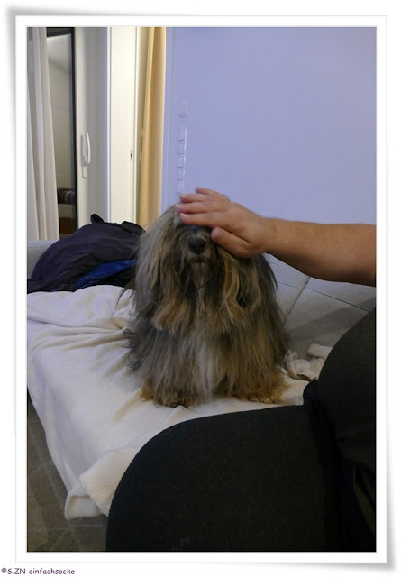 Socke macht sich - nach dem fast dreistündigen Spaziergang - ein Nestchen auf dem Sofa...