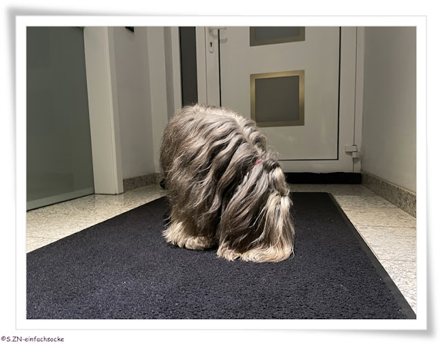 Socke begleitet IHN an den Dienstort und dort lag eine Salamischeibe. Socke zeigte diese an, nahm sie aber nicht. Braves Mädchen...